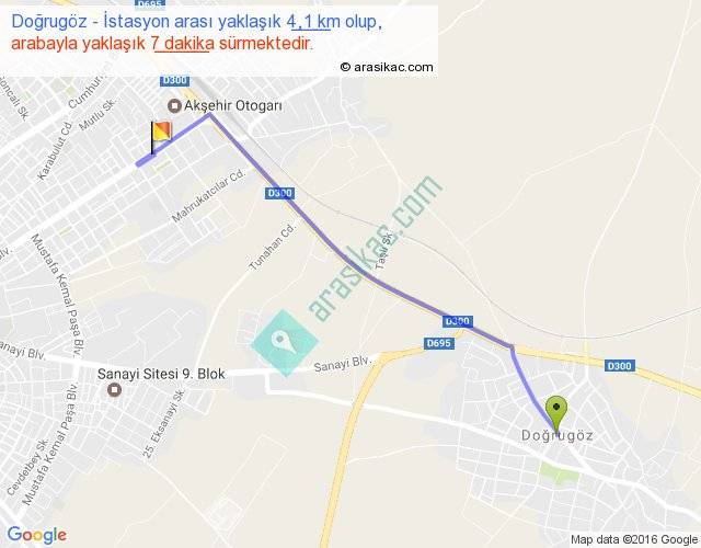 Doğrugöz - İstasyon arası yaklaşık olarak 90 km/h ile yukarıda belirtilen sürede olup, iki yerin kuş uçuşu uzaklığı (mesafesi) 3'dir. Yolculuk otobüsle 9 dakika sürmektedir.