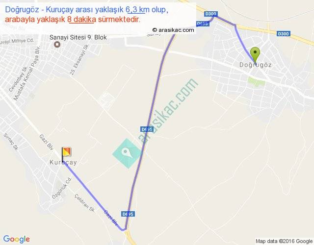 Doğrugöz - Kuruçay arası yaklaşık olarak 90 km/h ile yukarıda belirtilen sürede olup, iki yerin kuş uçuşu uzaklığı (mesafesi) 3'dir. Yolculuk otobüsle 10 dakika sürmektedir.