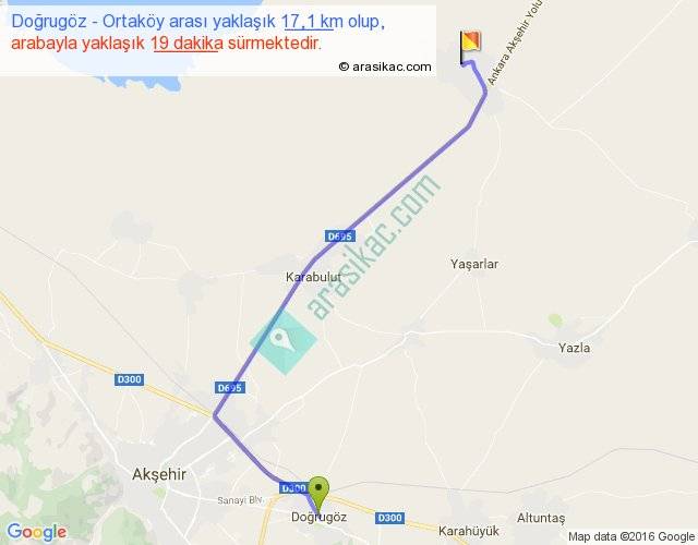 Doğrugöz - Ortaköy arası yaklaşık olarak 90 km/h ile yukarıda belirtilen sürede olup, iki yerin kuş uçuşu uzaklığı (mesafesi) 13'dir. Yolculuk otobüsle 24 dakika sürmektedir.