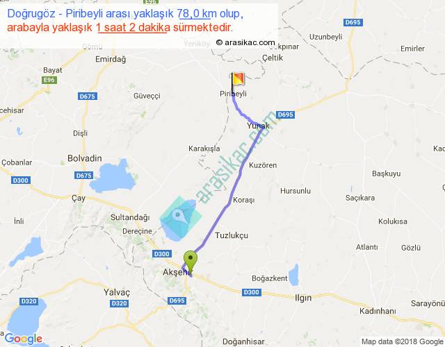 Doğrugöz - Piribeyli arası yaklaşık olarak 90 km/h ile yukarıda belirtilen sürede olup, iki yerin kuş uçuşu uzaklığı (mesafesi) 64'dir. Yolculuk otobüsle 1 saat 20 dakika sürmektedir.