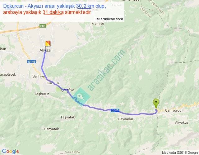 Dokurcun - Akyazı arası yaklaşık olarak 90 km/h ile yukarıda belirtilen sürede olup, iki yerin kuş uçuşu uzaklığı (mesafesi) 23'dir. Yolculuk otobüsle 40 dakika sürmektedir.