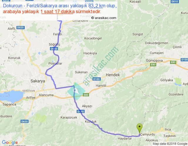 Dokurcun - Ferizli Sakarya arası yaklaşık olarak 90 km/h ile yukarıda belirtilen sürede olup, iki yerin kuş uçuşu uzaklığı (mesafesi) 56'dir. Yolculuk otobüsle 1 saat 40 dakika sürmektedir.