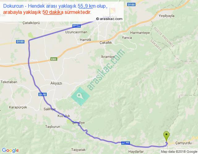 Dokurcun - Hendek arası yaklaşık olarak 90 km/h ile yukarıda belirtilen sürede olup, iki yerin kuş uçuşu uzaklığı (mesafesi) 26'dir. Yolculuk otobüsle 1 saat 5 dakika sürmektedir.