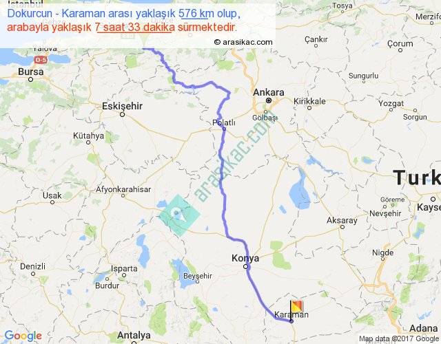 Dokurcun - Karaman arası yaklaşık olarak 90 km/h ile yukarıda belirtilen sürede olup, iki yerin kuş uçuşu uzaklığı (mesafesi) 427'dir. Eğer belirtilen yerler arasında uçak seferi var ise bu süre uçakla 39 dakika'ya kadar düşebilir. Yolculuk otobüsle 9 saat 48 dakika sürmektedir.