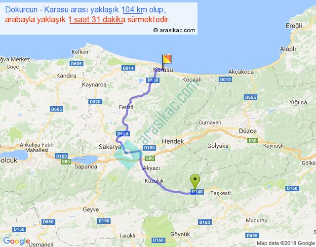 Dokurcun - Karasu arası yaklaşık olarak 90 km/h ile yukarıda belirtilen sürede olup, iki yerin kuş uçuşu uzaklığı (mesafesi) 59'dir. Yolculuk otobüsle 1 saat 58 dakika sürmektedir.