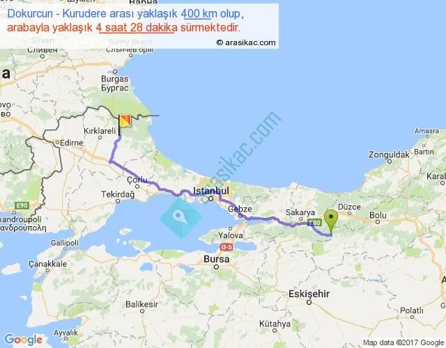 Dokurcun - Kurudere arası yaklaşık olarak 90 km/h ile yukarıda belirtilen sürede olup, iki yerin kuş uçuşu uzaklığı (mesafesi) 305'dir. Eğer belirtilen yerler arasında uçak seferi var ise bu süre uçakla 28 dakika'ya kadar düşebilir. Yolculuk otobüsle 5 saat 48 dakika sürmektedir.