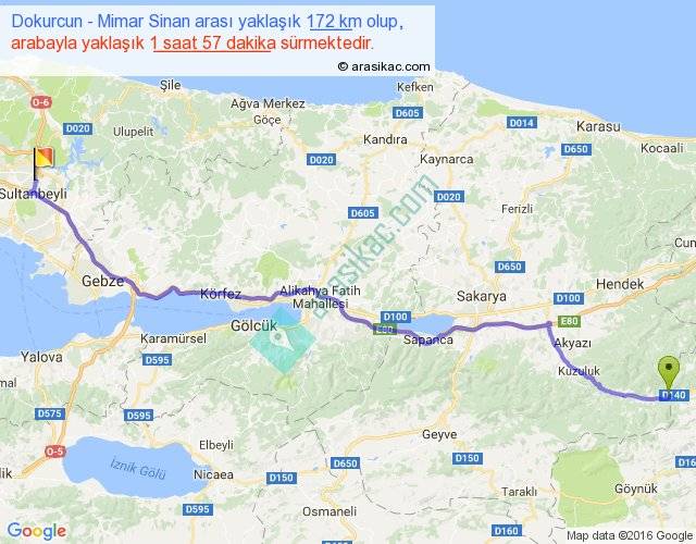 Dokurcun - Mimar Sinan arası yaklaşık olarak 90 km/h ile yukarıda belirtilen sürede olup, iki yerin kuş uçuşu uzaklığı (mesafesi) 141'dir. Yolculuk otobüsle 2 saat 32 dakika sürmektedir.
