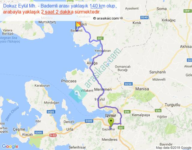 Dokuz Eylül Mh. - Bademli arası yaklaşık olarak 90 km/h ile yukarıda belirtilen sürede olup, iki yerin kuş uçuşu uzaklığı (mesafesi) 82'dir. Yolculuk otobüsle 2 saat 38 dakika sürmektedir.