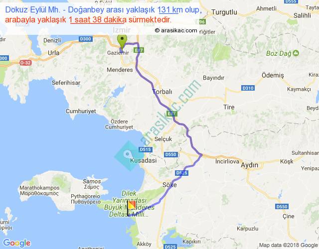 Dokuz Eylül Mh. - Doğanbey arası yaklaşık olarak 90 km/h ile yukarıda belirtilen sürede olup, iki yerin kuş uçuşu uzaklığı (mesafesi) 79'dir. Yolculuk otobüsle 2 saat 7 dakika sürmektedir.