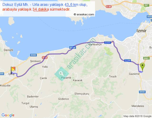 Dokuz Eylül Mh. - Urla arası yaklaşık olarak 90 km/h ile yukarıda belirtilen sürede olup, iki yerin kuş uçuşu uzaklığı (mesafesi) 33'dir. Yolculuk otobüsle 44 dakika sürmektedir.
