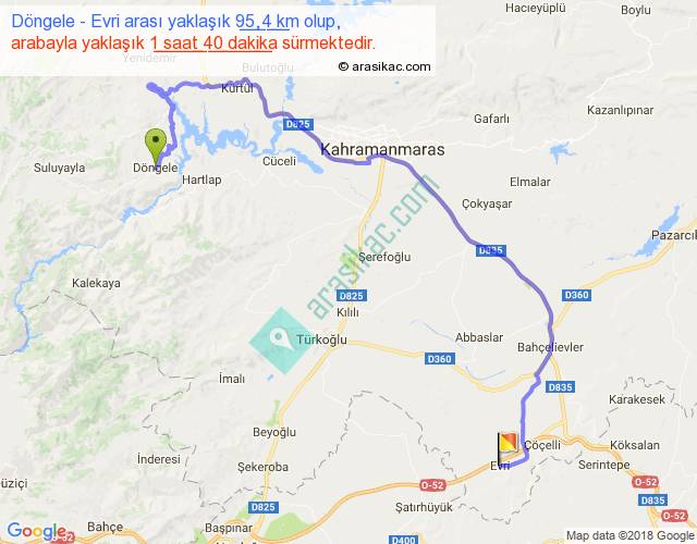 Döngele - Evri arası yaklaşık olarak 90 km/h ile yukarıda belirtilen sürede olup, iki yerin kuş uçuşu uzaklığı (mesafesi) 50'dir. Yolculuk otobüsle 2 saat 10 dakika sürmektedir.