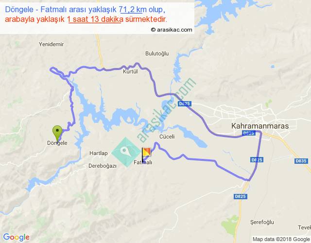 Döngele - Fatmalı arası yaklaşık olarak 90 km/h ile yukarıda belirtilen sürede olup, iki yerin kuş uçuşu uzaklığı (mesafesi) 11'dir. Yolculuk otobüsle 1 saat 34 dakika sürmektedir.