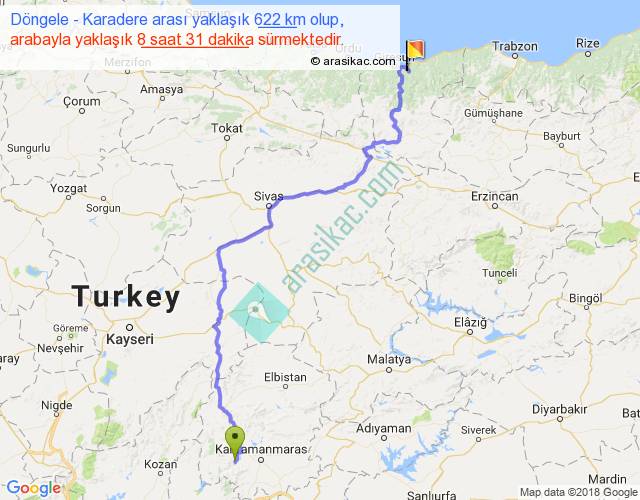 Döngele - Karadere arası yaklaşık olarak 90 km/h ile yukarıda belirtilen sürede olup, iki yerin kuş uçuşu uzaklığı (mesafesi) 402'dir. Eğer belirtilen yerler arasında uçak seferi var ise bu süre uçakla 37 dakika'ya kadar düşebilir. Yolculuk otobüsle 11 saat 4 dakika sürmektedir.