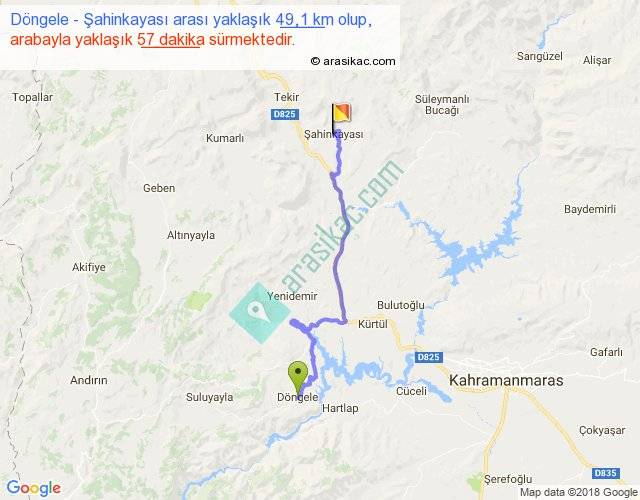 Döngele - Şahinkayası arası yaklaşık olarak 90 km/h ile yukarıda belirtilen sürede olup, iki yerin kuş uçuşu uzaklığı (mesafesi) 32'dir. Yolculuk otobüsle 1 saat 14 dakika sürmektedir.