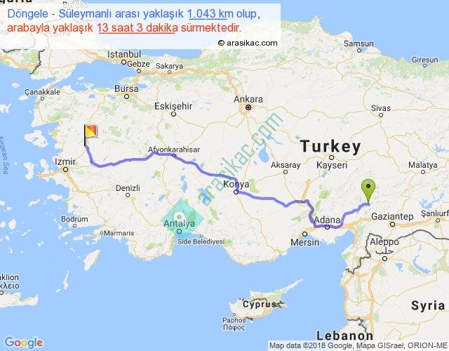 Döngele - Süleymanlı arası yaklaşık olarak 90 km/h ile yukarıda belirtilen sürede olup, iki yerin kuş uçuşu uzaklığı (mesafesi) 785'dir. Eğer belirtilen yerler arasında uçak seferi var ise bu süre uçakla 1 saat 12 dakika'ya kadar düşebilir. Yolculuk otobüsle 16 saat 57 dakika sürmektedir.