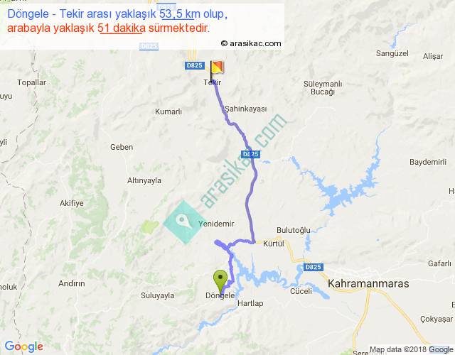 Döngele - Tekir arası yaklaşık olarak 90 km/h ile yukarıda belirtilen sürede olup, iki yerin kuş uçuşu uzaklığı (mesafesi) 36'dir. Yolculuk otobüsle 1 saat 6 dakika sürmektedir.