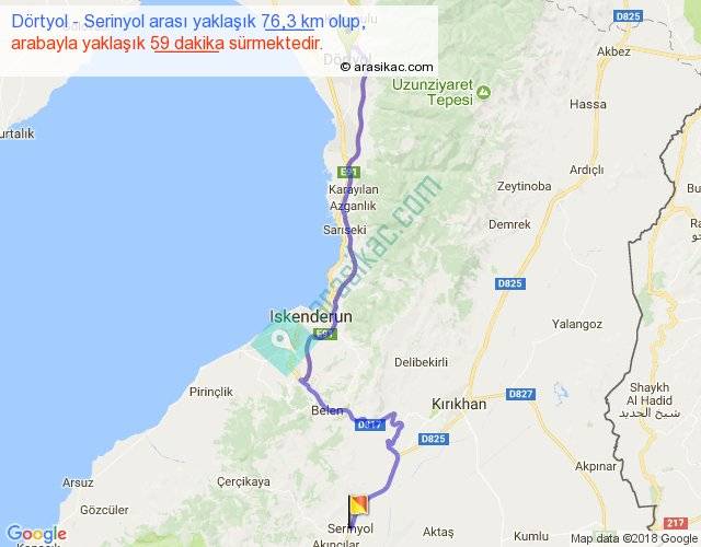 Dörtyol - Serinyol arası yaklaşık olarak 90 km/h ile yukarıda belirtilen sürede olup, iki yerin kuş uçuşu uzaklığı (mesafesi) 52'dir. Yolculuk otobüsle 1 saat 16 dakika sürmektedir.