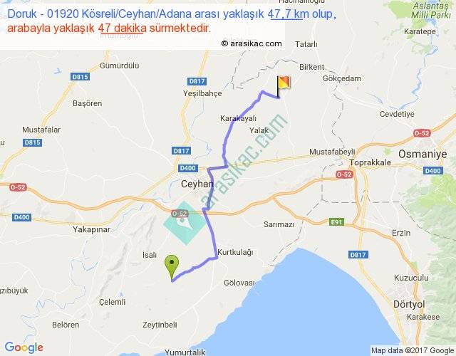 Doruk - 01920 Kösreli Ceyhan Adana arası yaklaşık olarak 90 km/h ile yukarıda belirtilen sürede olup, iki yerin kuş uçuşu uzaklığı (mesafesi) 36'dir. Yolculuk otobüsle 1 saat 1 dakika sürmektedir.