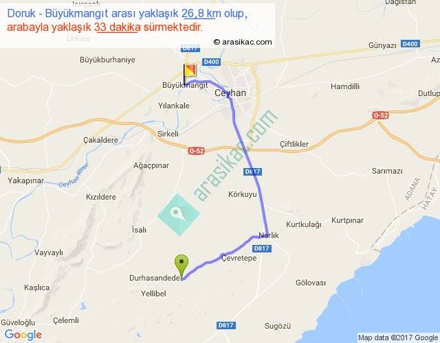 Doruk - Büyükmangıt arası yaklaşık olarak 90 km/h ile yukarıda belirtilen sürede olup, iki yerin kuş uçuşu uzaklığı (mesafesi) 17'dir. Yolculuk otobüsle 42 dakika sürmektedir.