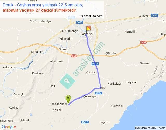 Doruk - Ceyhan arası yaklaşık olarak 90 km/h ile yukarıda belirtilen sürede olup, iki yerin kuş uçuşu uzaklığı (mesafesi) 17'dir. Yolculuk otobüsle 35 dakika sürmektedir.