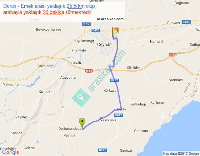 Doruk - Emek arası yaklaşık olarak 90 km/h ile yukarıda belirtilen sürede olup, iki yerin kuş uçuşu uzaklığı (mesafesi) 19'dir. Yolculuk otobüsle 33 dakika sürmektedir.