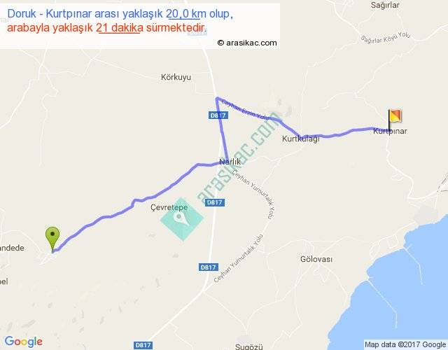 Doruk - Kurtpınar arası yaklaşık olarak 90 km/h ile yukarıda belirtilen sürede olup, iki yerin kuş uçuşu uzaklığı (mesafesi) 16'dir. Yolculuk otobüsle 27 dakika sürmektedir.