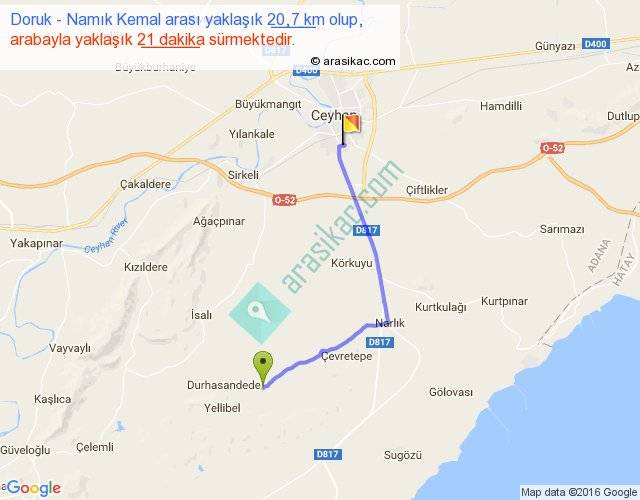 Doruk - Namık Kemal arası yaklaşık olarak 90 km/h ile yukarıda belirtilen sürede olup, iki yerin kuş uçuşu uzaklığı (mesafesi) 16'dir. Yolculuk otobüsle 27 dakika sürmektedir.