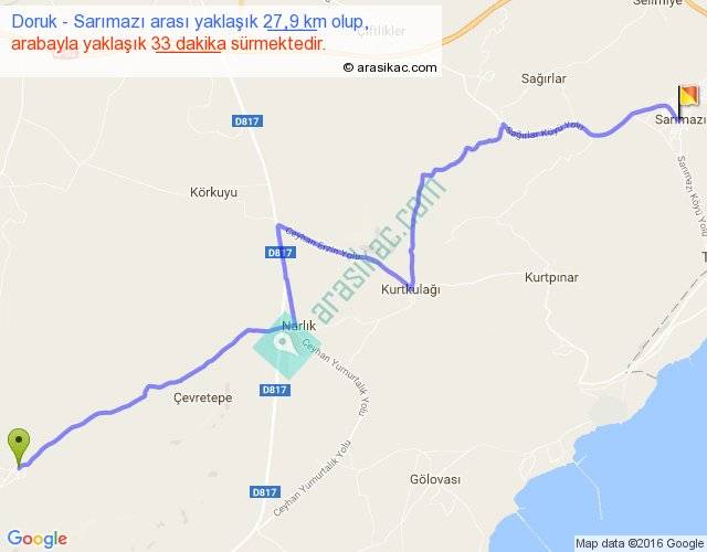 Doruk - Sarımazı arası yaklaşık olarak 90 km/h ile yukarıda belirtilen sürede olup, iki yerin kuş uçuşu uzaklığı (mesafesi) 21'dir. Yolculuk otobüsle 42 dakika sürmektedir.