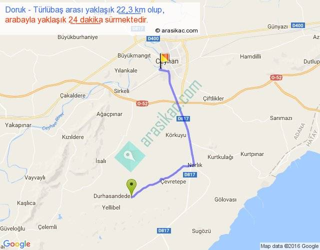Doruk - Türlübaş arası yaklaşık olarak 90 km/h ile yukarıda belirtilen sürede olup, iki yerin kuş uçuşu uzaklığı (mesafesi) 16'dir. Yolculuk otobüsle 31 dakika sürmektedir.