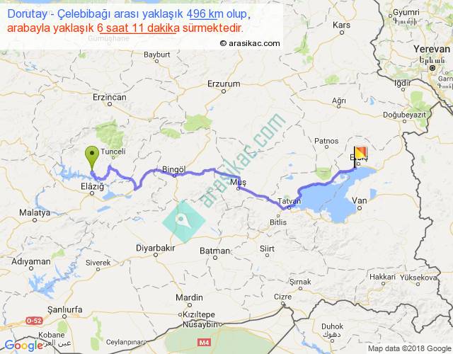 Dorutay - Çelebibağı arası yaklaşık olarak 90 km/h ile yukarıda belirtilen sürede olup, iki yerin kuş uçuşu uzaklığı (mesafesi) 351'dir. Eğer belirtilen yerler arasında uçak seferi var ise bu süre uçakla 32 dakika'ya kadar düşebilir. Yolculuk otobüsle 8 saat 2 dakika sürmektedir.