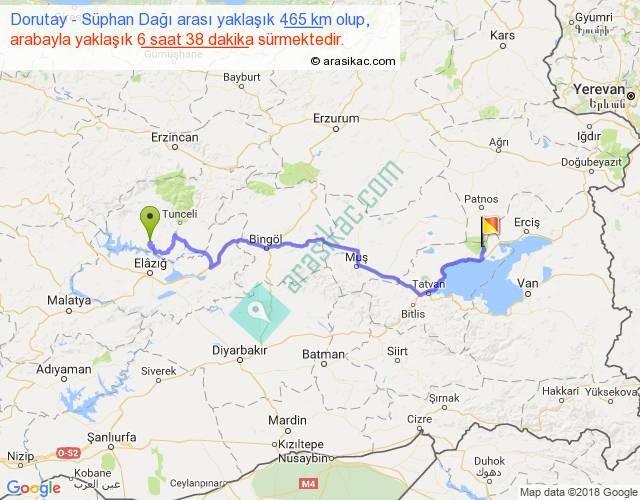 Dorutay - Süphan Dağı arası yaklaşık olarak 90 km/h ile yukarıda belirtilen sürede olup, iki yerin kuş uçuşu uzaklığı (mesafesi) 314'dir. Eğer belirtilen yerler arasında uçak seferi var ise bu süre uçakla 28 dakika'ya kadar düşebilir. Yolculuk otobüsle 8 saat 37 dakika sürmektedir.