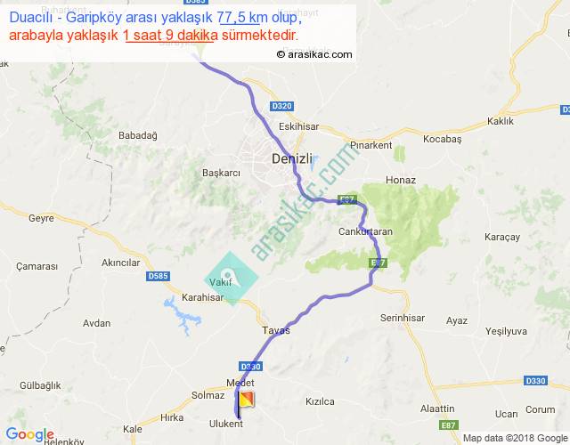 Duacılı - Garipköy arası yaklaşık olarak 90 km/h ile yukarıda belirtilen sürede olup, iki yerin kuş uçuşu uzaklığı (mesafesi) 49'dir. Yolculuk otobüsle 1 saat 29 dakika sürmektedir.
