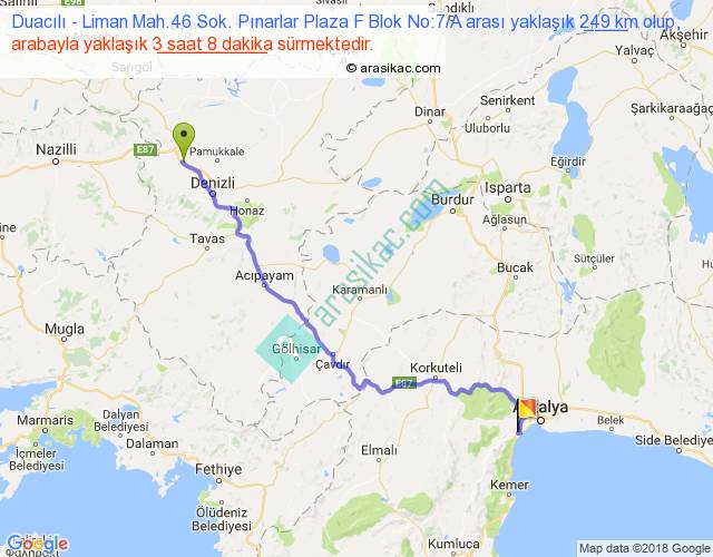 Duacılı - Liman Mah.46 Sok. Pınarlar Plaza F Blok No:7 A arası yaklaşık olarak 90 km/h ile yukarıda belirtilen sürede olup, iki yerin kuş uçuşu uzaklığı (mesafesi) 186'dir. Yolculuk otobüsle 4 saat 4 dakika sürmektedir.
