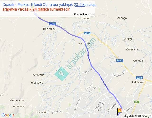 Duacılı - Merkez Efendi Cd. arası yaklaşık olarak 90 km/h ile yukarıda belirtilen sürede olup, iki yerin kuş uçuşu uzaklığı (mesafesi) 17'dir. Yolculuk otobüsle 31 dakika sürmektedir.
