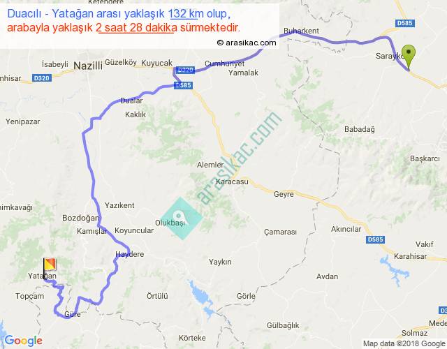 Duacılı - Yatağan arası yaklaşık olarak 90 km/h ile yukarıda belirtilen sürede olup, iki yerin kuş uçuşu uzaklığı (mesafesi) 72'dir. Yolculuk otobüsle 3 saat 12 dakika sürmektedir.