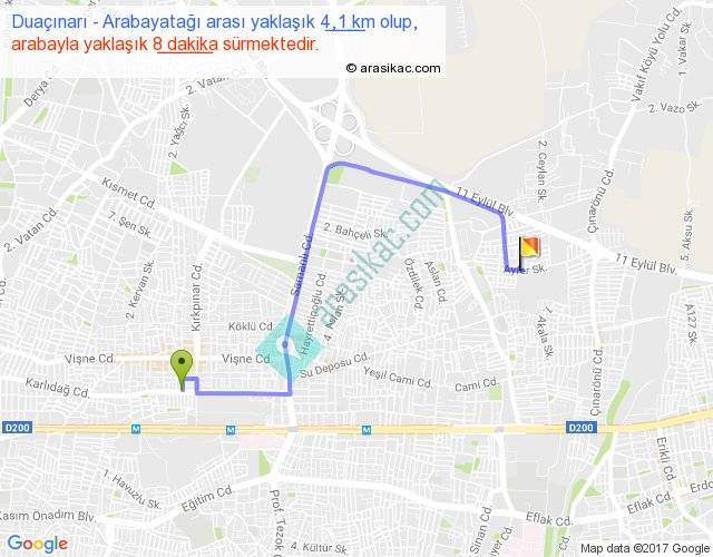 Duaçınarı - Arabayatağı arası yaklaşık olarak 90 km/h ile yukarıda belirtilen sürede olup, iki yerin kuş uçuşu uzaklığı (mesafesi) 2'dir. Yolculuk otobüsle 10 dakika sürmektedir.
