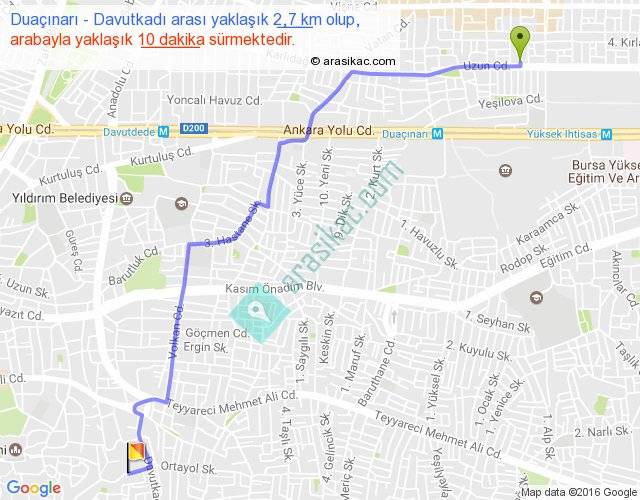 Duaçınarı - Davutkadı arası yaklaşık olarak 90 km/h ile yukarıda belirtilen sürede olup, iki yerin kuş uçuşu uzaklığı (mesafesi) 2'dir. Yolculuk otobüsle 13 dakika sürmektedir.
