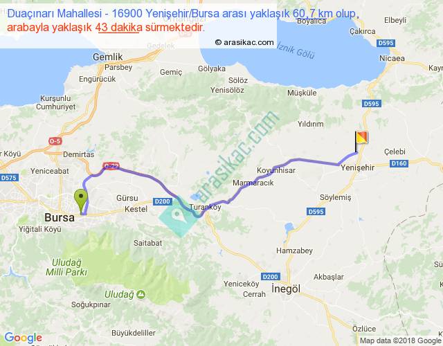 Duaçınarı Mahallesi - 16900 Yenişehir Bursa arası yaklaşık olarak 90 km/h ile yukarıda belirtilen sürede olup, iki yerin kuş uçuşu uzaklığı (mesafesi) 47'dir. Yolculuk otobüsle 55 dakika sürmektedir.