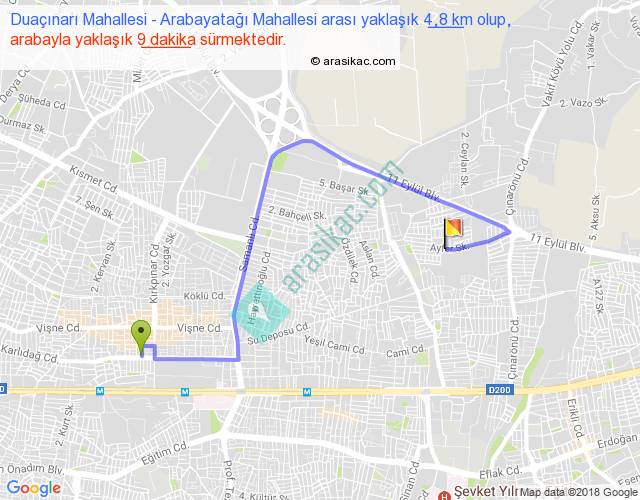 Duaçınarı Mahallesi - Arabayatağı Mahallesi arası yaklaşık olarak 90 km/h ile yukarıda belirtilen sürede olup, iki yerin kuş uçuşu uzaklığı (mesafesi) 2'dir. Yolculuk otobüsle 11 dakika sürmektedir.