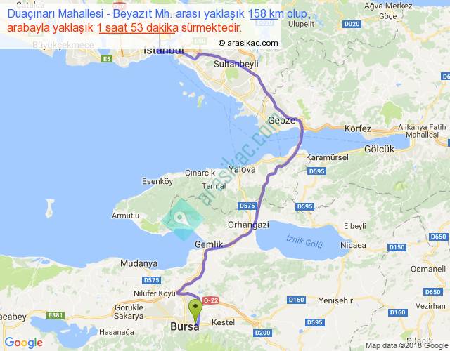 Duaçınarı Mahallesi - Beyazıt Mh. arası yaklaşık olarak 90 km/h ile yukarıda belirtilen sürede olup, iki yerin kuş uçuşu uzaklığı (mesafesi) 91'dir. Yolculuk otobüsle 2 saat 26 dakika sürmektedir.