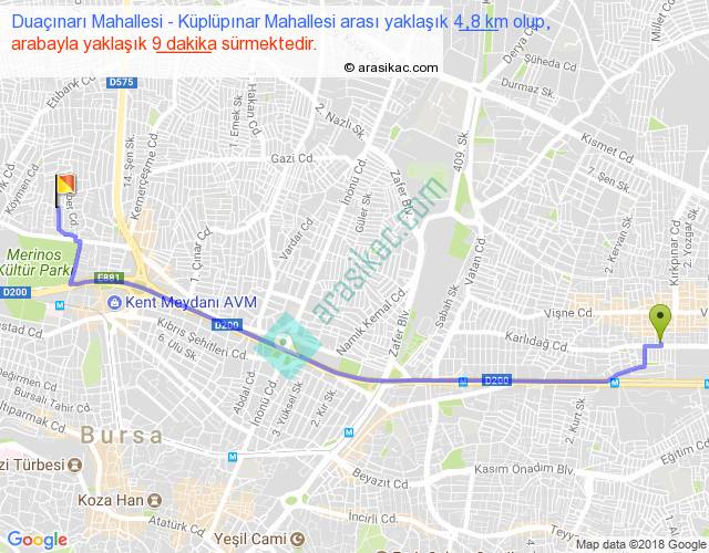 Duaçınarı Mahallesi - Küplüpınar Mahallesi arası yaklaşık olarak 90 km/h ile yukarıda belirtilen sürede olup, iki yerin kuş uçuşu uzaklığı (mesafesi) 4'dir. Yolculuk otobüsle 11 dakika sürmektedir.
