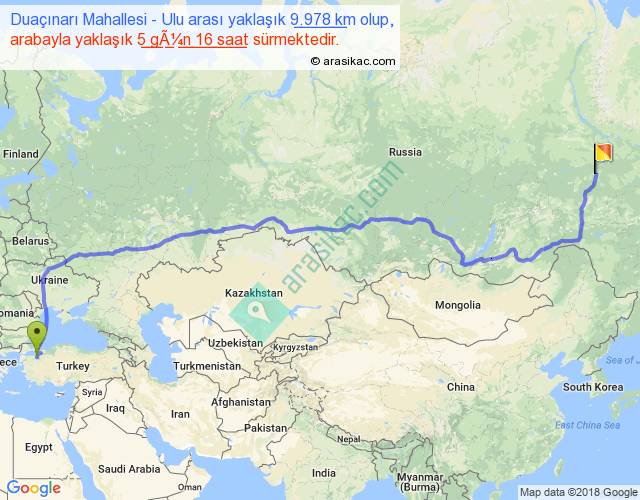 Duaçınarı Mahallesi - Ulu arası yaklaşık olarak 90 km/h ile yukarıda belirtilen sürede olup, iki yerin kuş uçuşu uzaklığı (mesafesi) 6590'dir. Eğer belirtilen yerler arasında uçak seferi var ise bu süre uçakla 10 saat 08 dakika'ya kadar düşebilir. Yolculuk otobüsle 7 gün 8 saat sürmektedir.