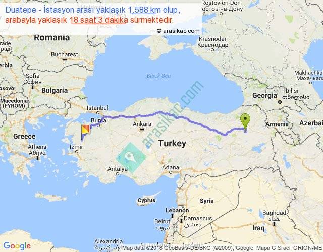 Duatepe - İstasyon arası yaklaşık olarak 90 km/h ile yukarıda belirtilen sürede olup, iki yerin kuş uçuşu uzaklığı (mesafesi) 1213'dir. Eğer belirtilen yerler arasında uçak seferi var ise bu süre uçakla 1 saat 51 dakika'ya kadar düşebilir. Yolculuk otobüsle 23 saat 27 dakika sürmektedir.