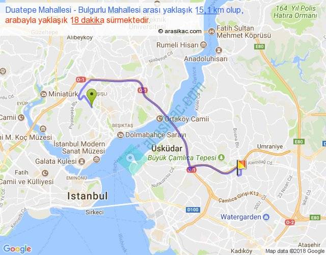 Duatepe Mahallesi - Bulgurlu Mahallesi arası yaklaşık olarak 90 km/h ile yukarıda belirtilen sürede olup, iki yerin kuş uçuşu uzaklığı (mesafesi) 9'dir. Yolculuk otobüsle 23 dakika sürmektedir.