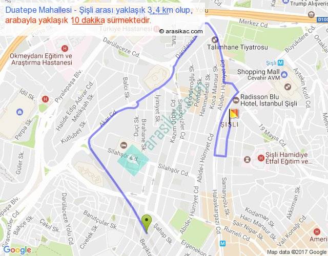 Duatepe Mahallesi - Şişli arası yaklaşık olarak 90 km/h ile yukarıda belirtilen sürede olup, iki yerin kuş uçuşu uzaklığı (mesafesi) 1'dir. Yolculuk otobüsle 13 dakika sürmektedir.