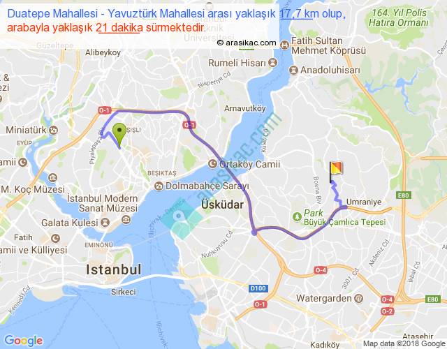 Duatepe Mahallesi - Yavuztürk Mahallesi arası yaklaşık olarak 90 km/h ile yukarıda belirtilen sürede olup, iki yerin kuş uçuşu uzaklığı (mesafesi) 9'dir. Yolculuk otobüsle 27 dakika sürmektedir.