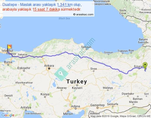 Duatepe - Maslak arası yaklaşık olarak 90 km/h ile yukarıda belirtilen sürede olup, iki yerin kuş uçuşu uzaklığı (mesafesi) 1086'dir. Eğer belirtilen yerler arasında uçak seferi var ise bu süre uçakla 1 saat 40 dakika'ya kadar düşebilir. Yolculuk otobüsle 19 saat 39 dakika sürmektedir.