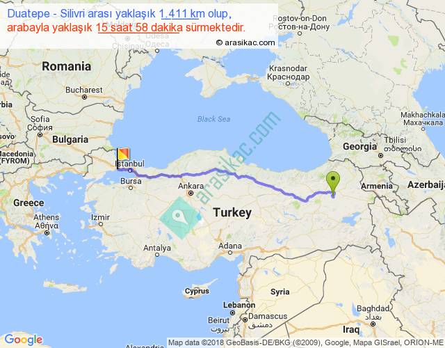 Duatepe - Silivri arası yaklaşık olarak 90 km/h ile yukarıda belirtilen sürede olup, iki yerin kuş uçuşu uzaklığı (mesafesi) 1150'dir. Eğer belirtilen yerler arasında uçak seferi var ise bu süre uçakla 1 saat 46 dakika'ya kadar düşebilir. Yolculuk otobüsle 20 saat 45 dakika sürmektedir.