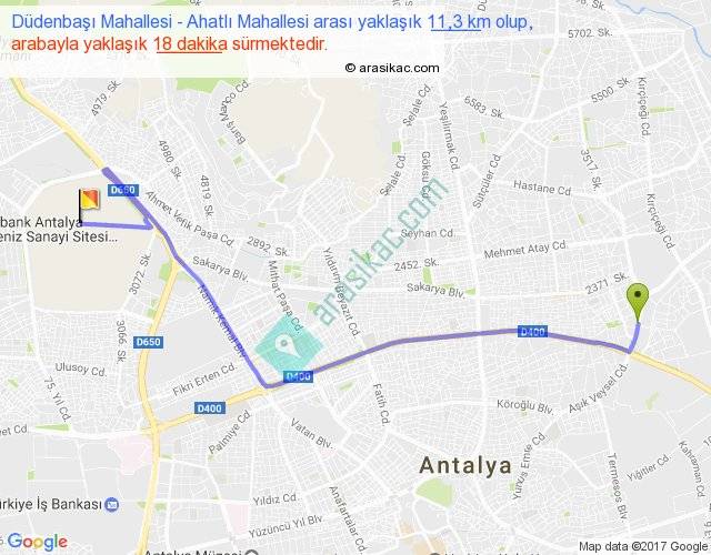 Düdenbaşı Mahallesi - Ahatlı Mahallesi arası yaklaşık olarak 90 km/h ile yukarıda belirtilen sürede olup, iki yerin kuş uçuşu uzaklığı (mesafesi) 8'dir. Yolculuk otobüsle 23 dakika sürmektedir.