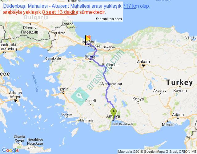 Düdenbaşı Mahallesi - Atakent Mahallesi arası yaklaşık olarak 90 km/h ile yukarıda belirtilen sürede olup, iki yerin kuş uçuşu uzaklığı (mesafesi) 488'dir. Eğer belirtilen yerler arasında uçak seferi var ise bu süre uçakla 45 dakika'ya kadar düşebilir. Yolculuk otobüsle 10 saat 40 dakika sürmektedir.